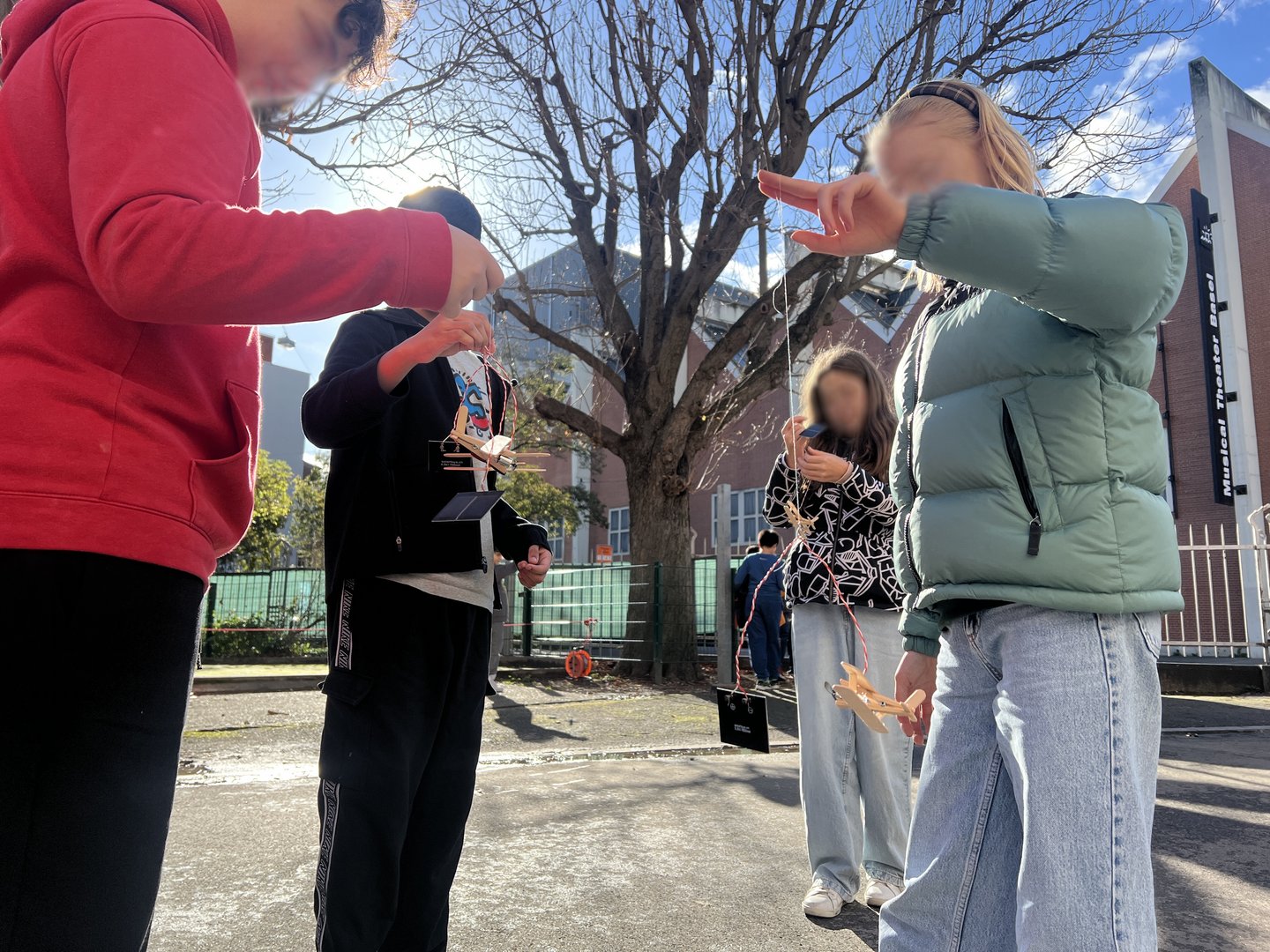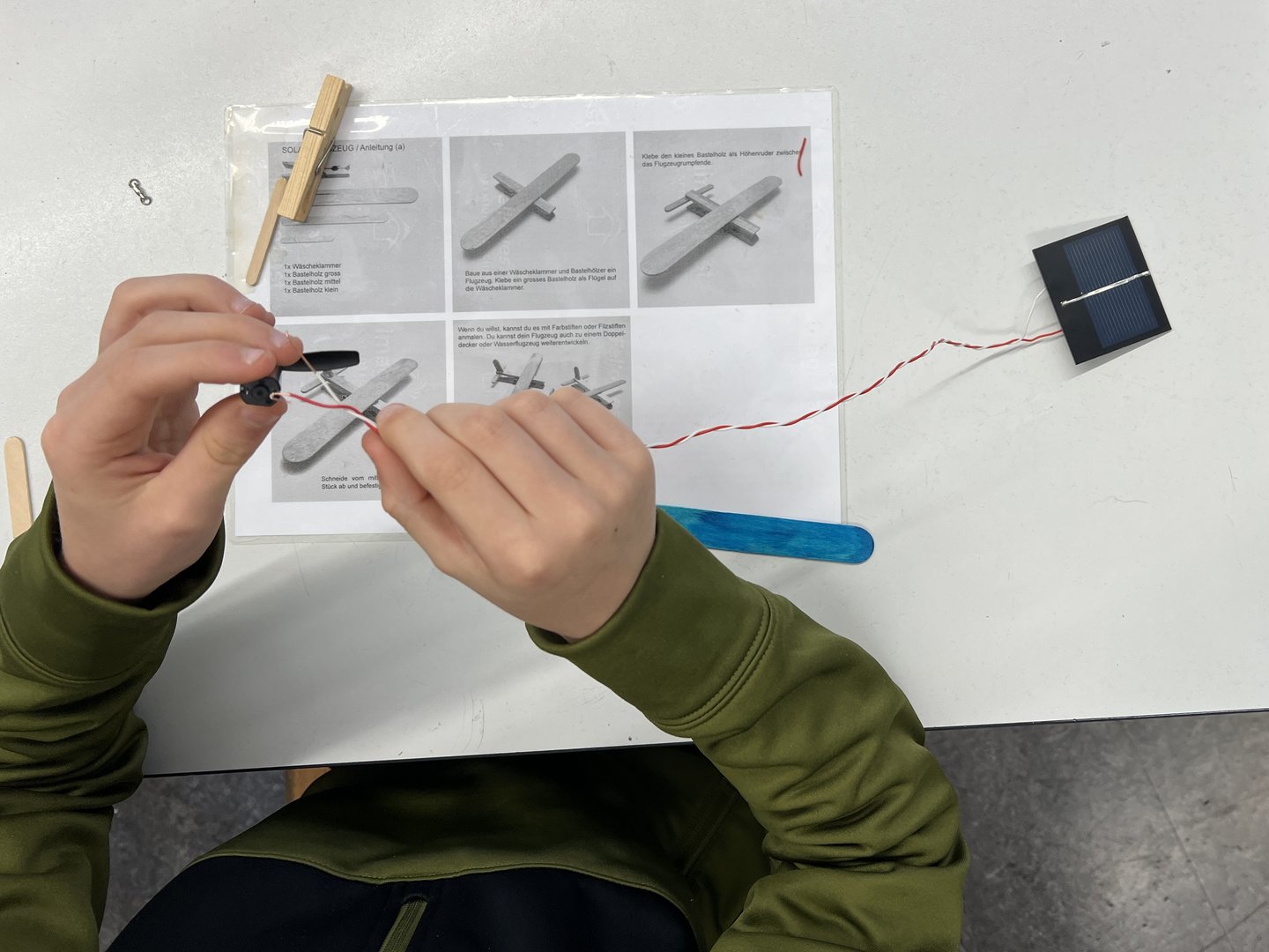 Gemeinsam erkunden wir auf Google Earth, wo bereits grosse Solaranlagen stehen und wie diese aussehen. Auf einerKarte von swisstopo erkennen wir, dass sich das Schuldach mit einem potenziellen Jahresertrag von rund CHF 17'240 „sehr gut“ für eine Photovoltaikanlage eignet. Nachdem wir die Leistung grosser Photovoltaikanlagen in Basel (Grosspeter Tower, Messe Basel, St. Jakob Park und Multiterminal 4 im Rheinhafen) mit jenen der Laufwasserkraftwerke Riehenteich und Birsfelden verglichen haben, bauen wir eine eigene kleine PV-Anwendung. Das Mini-Flugzeug, das wir konstruieren, fliegt bereits bei diffusem Licht im Kreis – also auch ohne direkte Sonneneinstrahlung. Anschliessend lernen wir den Aufbau und die Funktionsweise einer Solarzelle kennen: Aus welchen Materialien sie besteht, woher die Rohstoffe stammen und wie durch Photovoltaik (altgriechisch „phōs“ = Licht und „Volt“ = Einheit für elektrische Spannung) elektrische Energie entsteht.