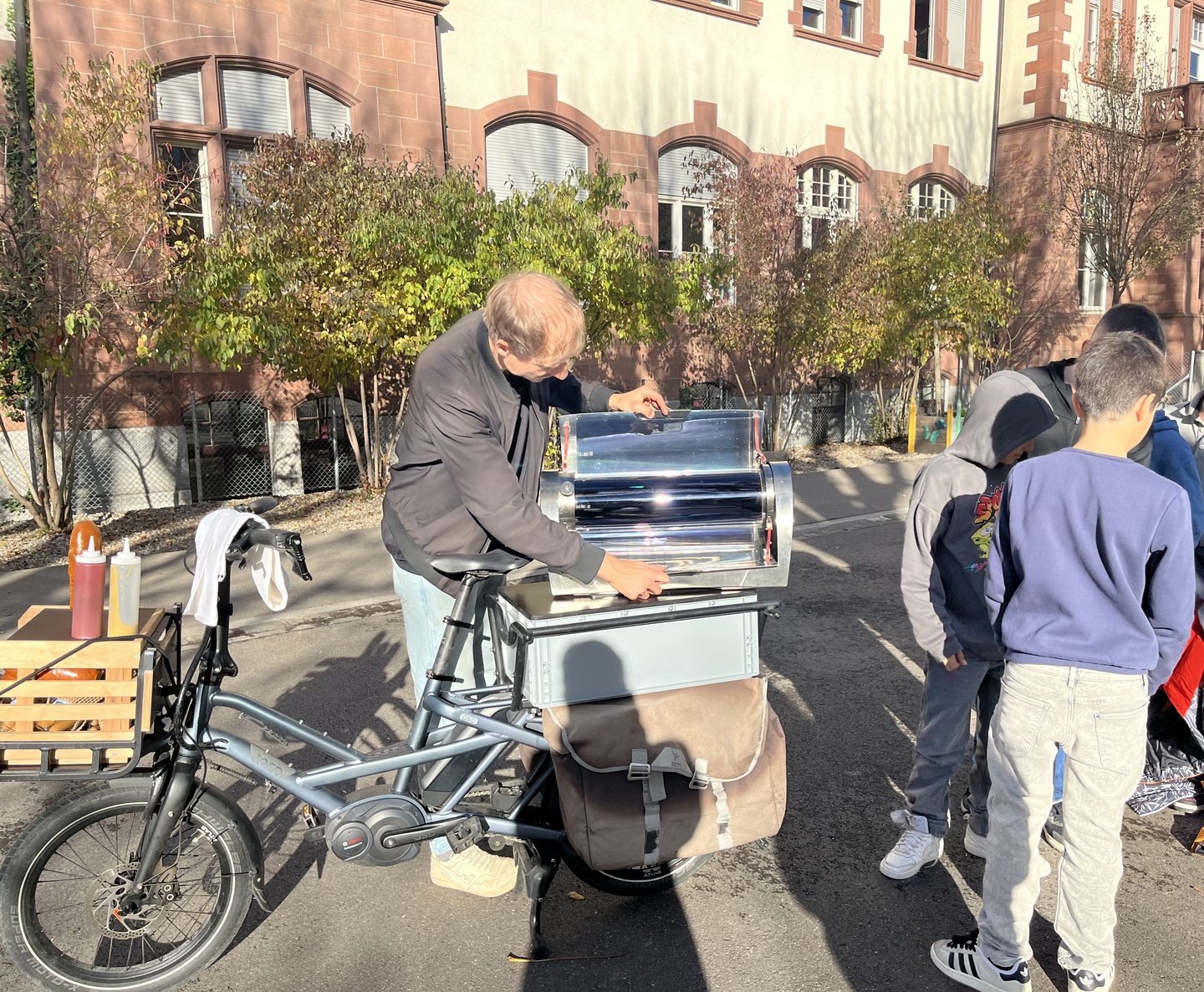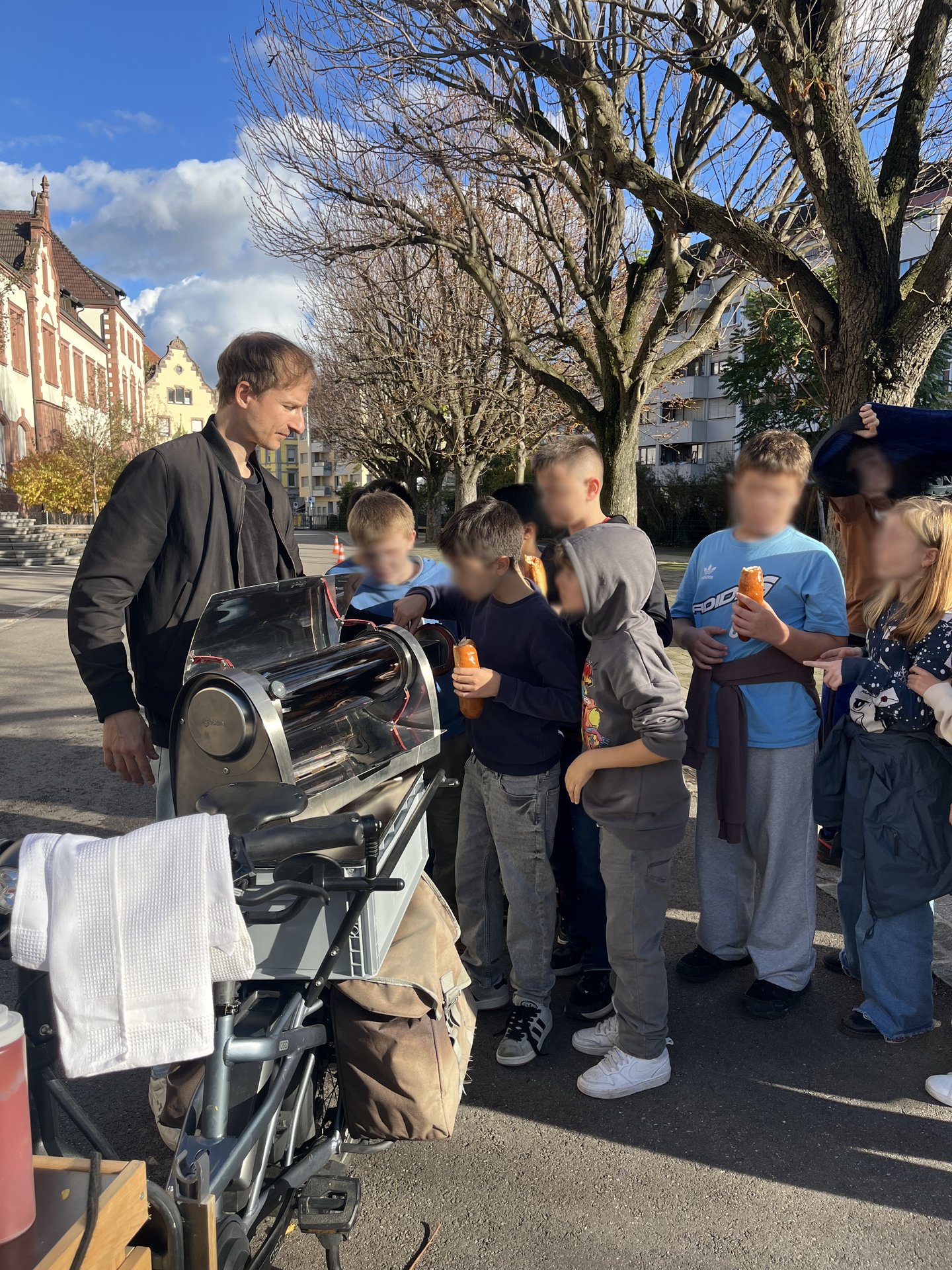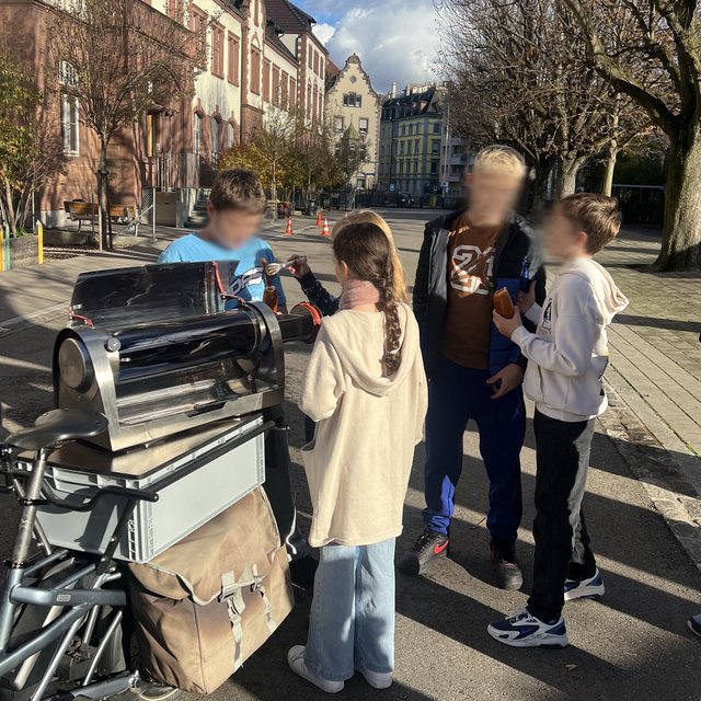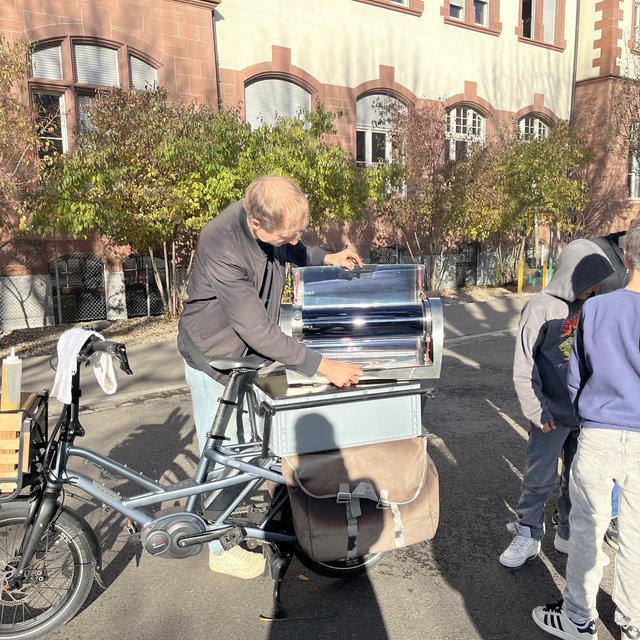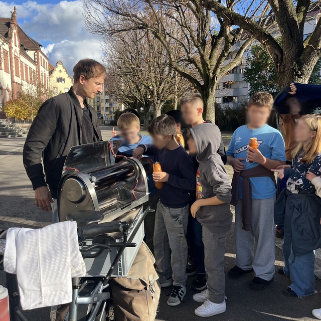 Am Nachmittag findet der Unterricht im Freien statt. Zum Glück ist der Himmel fast wolkenlos, denn für die Solarthermie benötigen wir im Gegensatz zur Photovoltaik direktes Sonnenlicht. Mit Lupen und einem Parabolspiegel bündeln wir die Sonnenstrahlen, bis eine Zeitung Feuer fängt. Mit Handspiegeln ausgerüstet und als ganze Schulklasse im Kreis aufgestellt imitieren wir Europas grösstes Solarturmkraftwerk Planta Solar 20 (Andalusien) und lassen alleine mit der Kraft der Sonne in der Mitte des Kreises einen Ballon zerplatzen. Ein echtes solarthermisches Kraftwerk funktioniert ähnlich wie ein herkömmliches Dampfkraftwerk, nur dass anstelle fossiler Brennstoffe konzentrierte Sonnenstrahlung genutzt wird. An der Turmspitze entstehen so Temperaturen von über 1'000 °C. Als Wärmeträger dienen Flüssigsalze, die die Hitze speichern und den Betrieb auch nach Sonnenuntergang ermöglichen. Etwas weniger heiss werden Parabolrinnenkraftwerke. Gewölbte Spiegel bündeln das einfallende Sonnenlicht in einer Brennlinie. Wir haben einen solchen Röhrenkollektor mit Spiegel als mobilen Hotdog-Grill auf ein E-Bike montiert. Zum Abschluss gibt es für alle Teilnehmenden ein warmes Wienerli oder ein vegetarisches Würstchen im Brot. Selbstverständlich erhitzt mit Sonnenkraft.