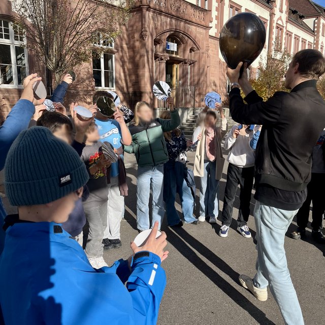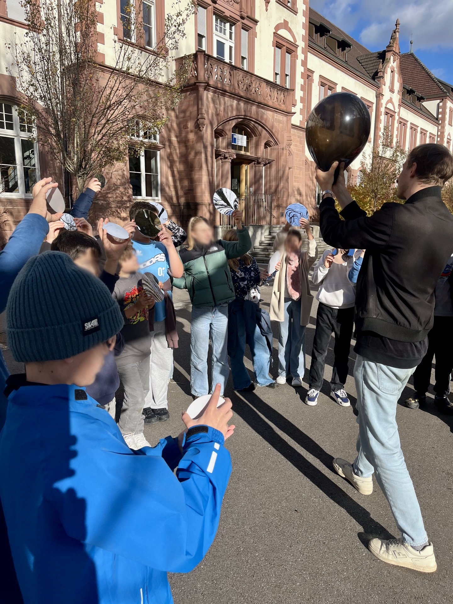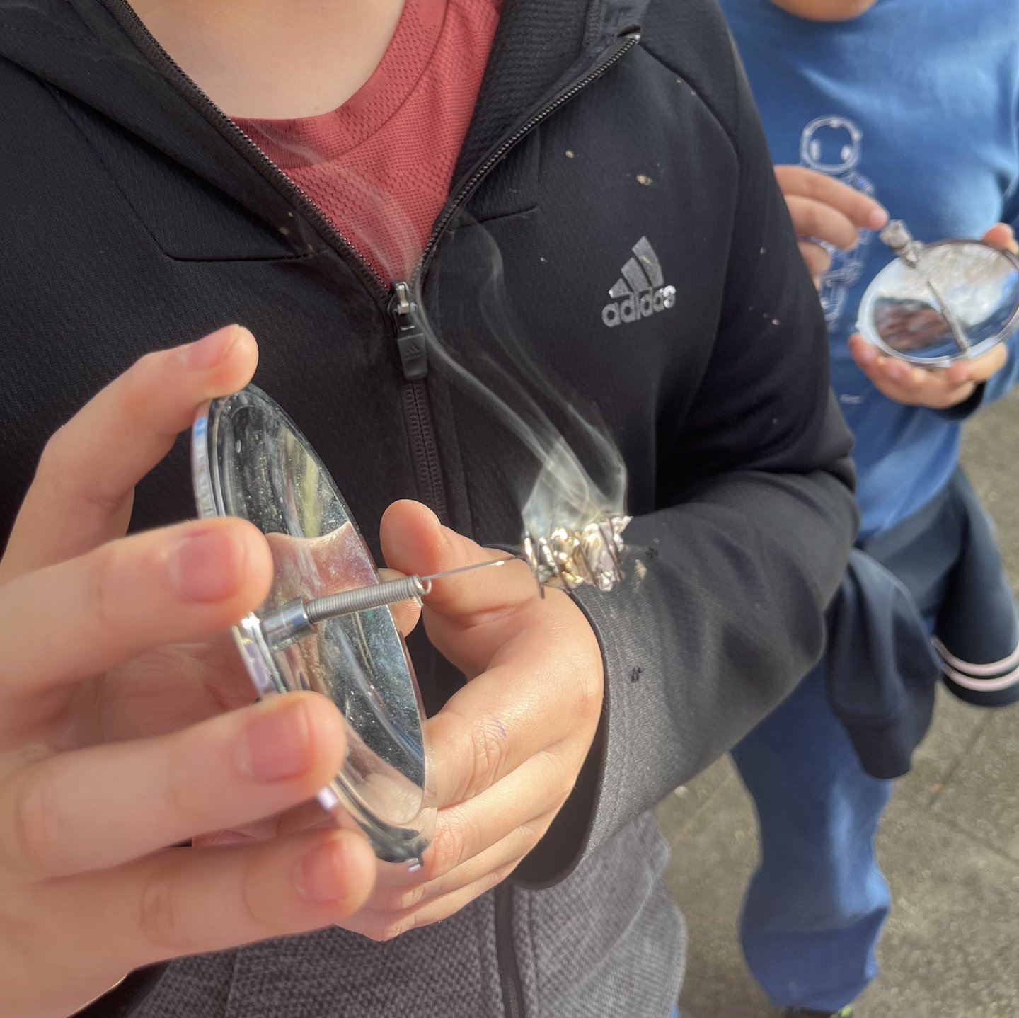 Am Nachmittag findet der Unterricht im Freien statt. Zum Glück ist der Himmel fast wolkenlos, denn für die Solarthermie benötigen wir im Gegensatz zur Photovoltaik direktes Sonnenlicht. Mit Lupen und einem Parabolspiegel bündeln wir die Sonnenstrahlen, bis eine Zeitung Feuer fängt. Mit Handspiegeln ausgerüstet und als ganze Schulklasse im Kreis aufgestellt imitieren wir Europas grösstes Solarturmkraftwerk Planta Solar 20 (Andalusien) und lassen alleine mit der Kraft der Sonne in der Mitte des Kreises einen Ballon zerplatzen. Ein echtes solarthermisches Kraftwerk funktioniert ähnlich wie ein herkömmliches Dampfkraftwerk, nur dass anstelle fossiler Brennstoffe konzentrierte Sonnenstrahlung genutzt wird. An der Turmspitze entstehen so Temperaturen von über 1'000 °C. Als Wärmeträger dienen Flüssigsalze, die die Hitze speichern und den Betrieb auch nach Sonnenuntergang ermöglichen. Etwas weniger heiss werden Parabolrinnenkraftwerke. Gewölbte Spiegel bündeln das einfallende Sonnenlicht in einer Brennlinie. Wir haben einen solchen Röhrenkollektor mit Spiegel als mobilen Hotdog-Grill auf ein E-Bike montiert. Zum Abschluss gibt es für alle Teilnehmenden ein warmes Wienerli oder ein vegetarisches Würstchen im Brot. Selbstverständlich erhitzt mit Sonnenkraft.