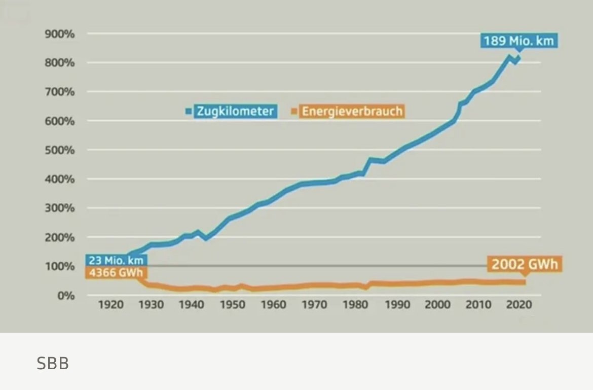 Ein gutes Beispiel für Effizienzsteigerung mittels Elektrifizierung ist die Schweizerische Bundesbahn (SBB). Der Bahnverkehr in der Schweiz hat in den letzten 100 Jahren um das zehnfache zugenommen, die Züge sind schneller und komfortabler geworden und trotzdem hat sich der Energieverbrauch seither halbiert. In den 1920er-Jahren ist die Eisenbahn das wichtigste Transportmittel. In der Schweiz wurden damals bereits stattliche 23 Mio. Zugkilometer pro Jahr zurückgelegt, mit einem jährlichen Energieverbrauch über 4'000 GWh – noch mit kohlebetriebenen Dampfloks. 1919 kam dann die Elektrifizierung der Eisenbahn. Das Hauptmotiv war «die Verwertung der nationalen Wasserkräfte an Stelle der ausländischen Kohle», so formuliert es eine Studienkommission 1912. Die Kohleknappheit im Ersten Weltkrieg gab den nötigen Anschub. Es war ein Meilenstein in Sachen Energie-Effizienz: Bereits die legendären Krokodilloks, waren deutlich effizienter als die Dampflokomotiven. Sie nutzten bei der Talfahrt über den Gotthard bereits die Rekuperation beim Bremsen, um Energie zurückzugewinnen.